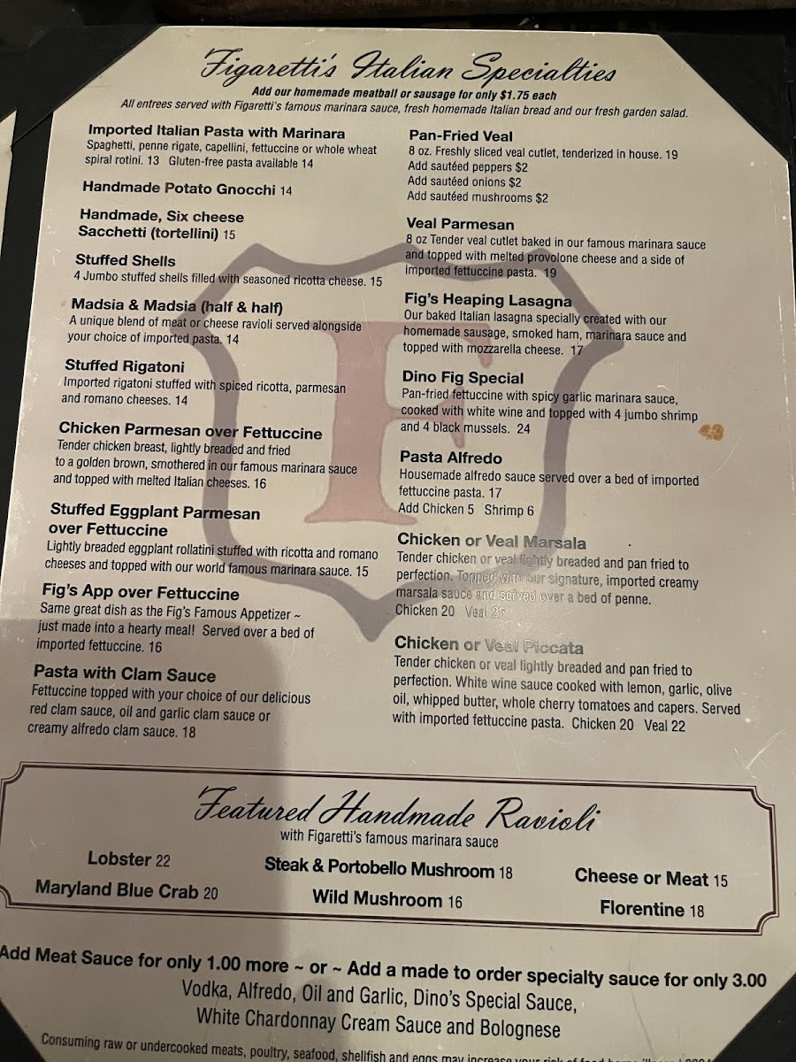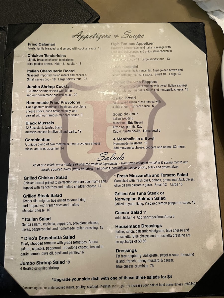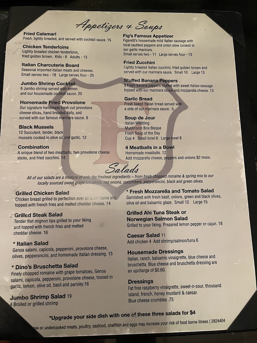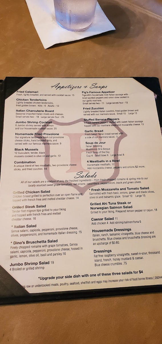 Steak and seafood choices are also prominent, including Fig’s Famous Chargrilled Center-Cut Pork Chops, 8oz Center-Cut Black Angus Filet Mignon, and a 20oz Choice Center Cut Bone-In Strip Steak, served with classic sides like garlic mashed potatoes, baked potato, broccoli, and asparagus.