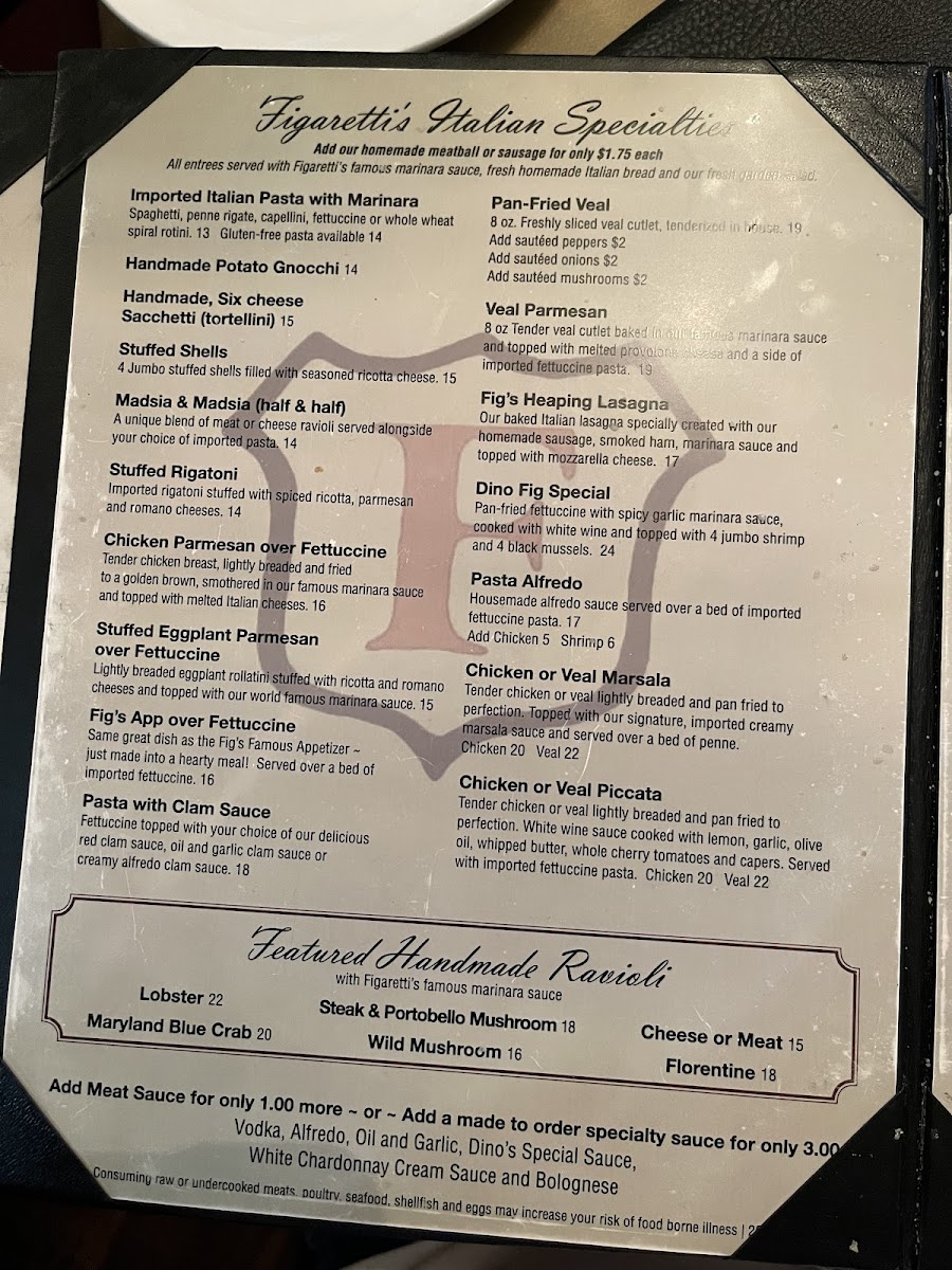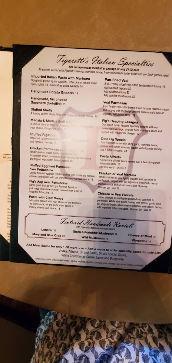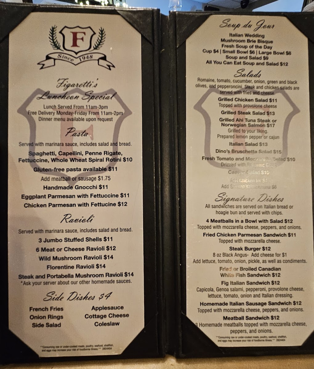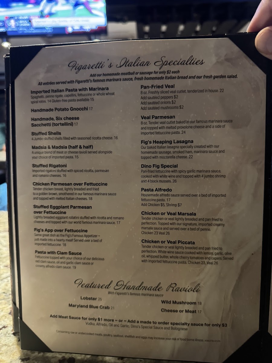 Steak and seafood choices are also prominent, including Fig’s Famous Chargrilled Center-Cut Pork Chops, 8oz Center-Cut Black Angus Filet Mignon, and a 20oz Choice Center Cut Bone-In Strip Steak, served with classic sides like garlic mashed potatoes, baked potato, broccoli, and asparagus.