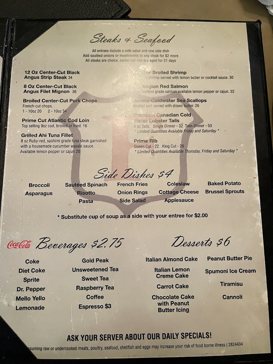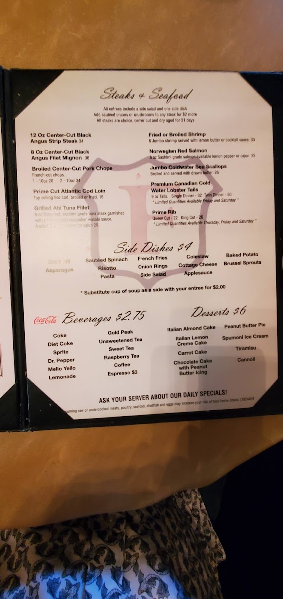 The menu offers a diverse range of Italian and American cuisine, with selections suitable for casual dining and family meals. It features traditional Italian dishes such as Eggplant Parmesan with Fettuccine, Stuffed Shells, Chicken Marsala, Veal Parmesan, Chicken Alfredo, and Chicken Picatta. Seafood options include Fried Calamari, Linguine with Clam Sauce, Lobster Ravioli with Vodka Sauce, Salmon, Tuna, and Jumbo Shrimp preparations.